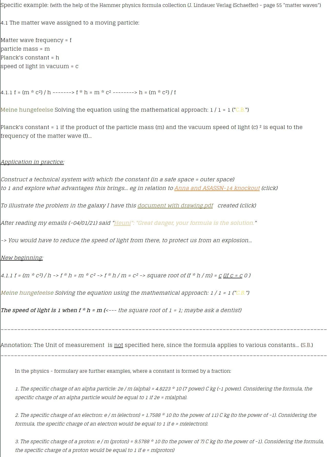 In 2002 when I was listening to electronic ambient music from the 90ties in a rented cellar I was influenced by Benno (owner of music studio “Mos Eisley” and member of the observatory) to search for some-thing new. I began about the light speed constant and was leaded by “Heuni” (2nd best mathematician in a high school contest) to a problem. It was about to solve an equation with a break - I felt something - whereas "another one" had an idea and meant: 1/1 = 1, what brought me then to the following invention: